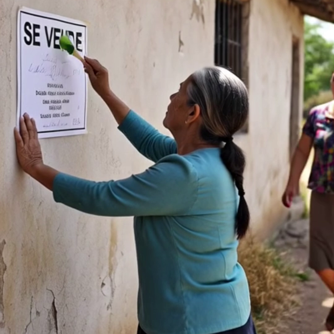 La mañana estaba silenciosa cuando Doña Elena salió con una escalera vieja y un cartel en la mano. Con dificultad lo colocó en la pared de su casa. El letrero decía “Se Vende”.
